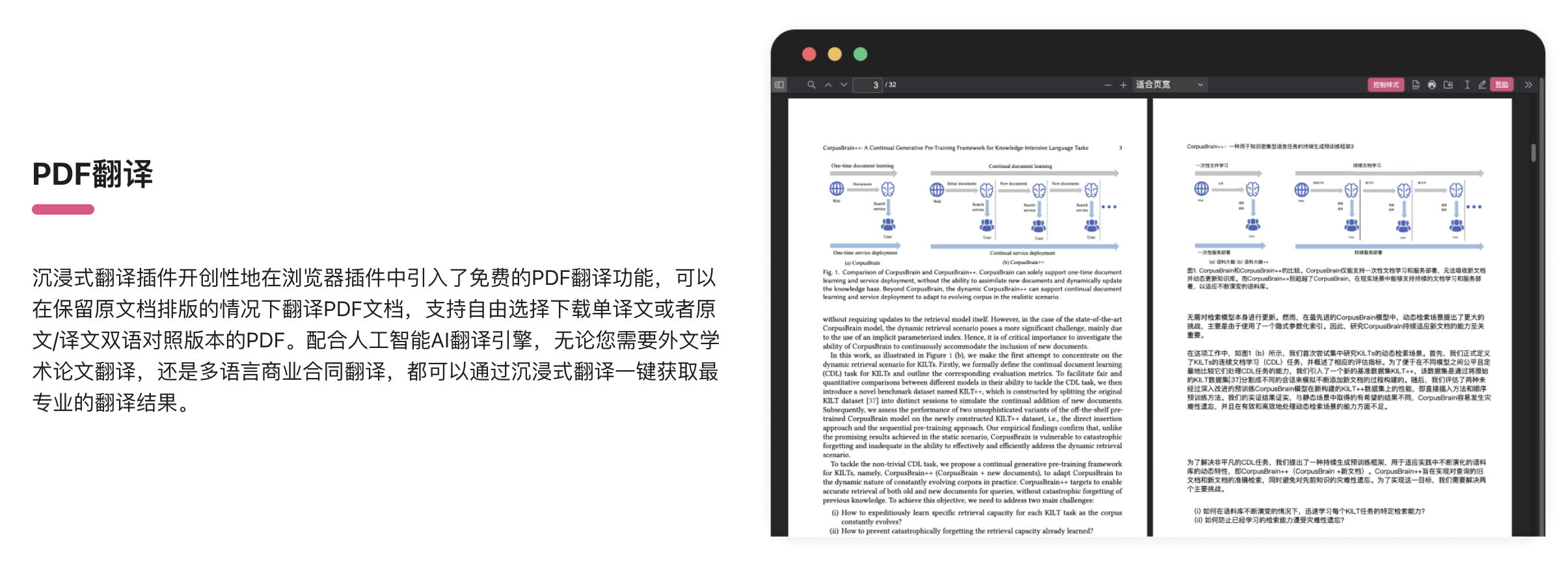 PDF翻译:沉浸式翻译插件开创性地在浏览器插件中引入了免费的PDF翻译功能,可以在保留原文档排版的情况下翻译PDF文档,支持自由选择下载单译文或者原文/译文双语对照版本的PDF。配合人工智能AI翻译引擎,无论您需要外文学术论文翻译,还是多语言商业合同翻译,都可以通过沉浸式翻译一键获取最专业的翻译结果。